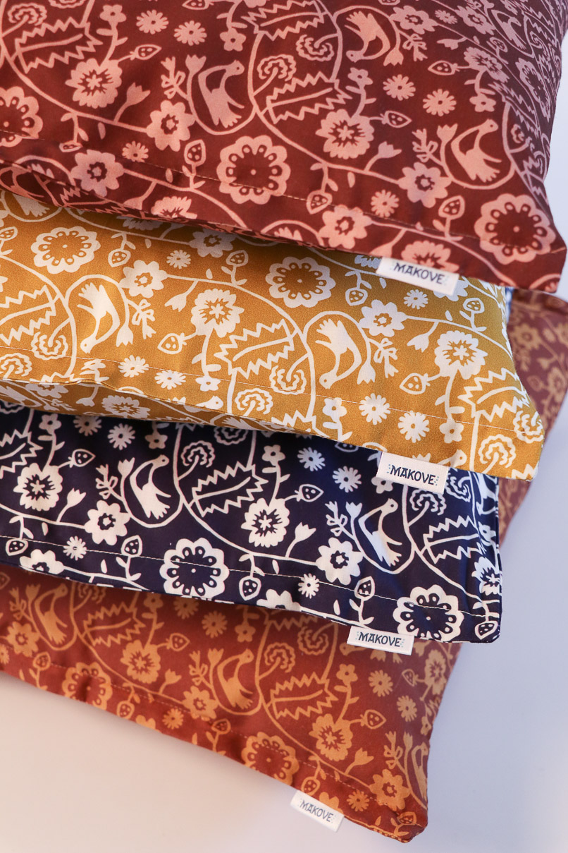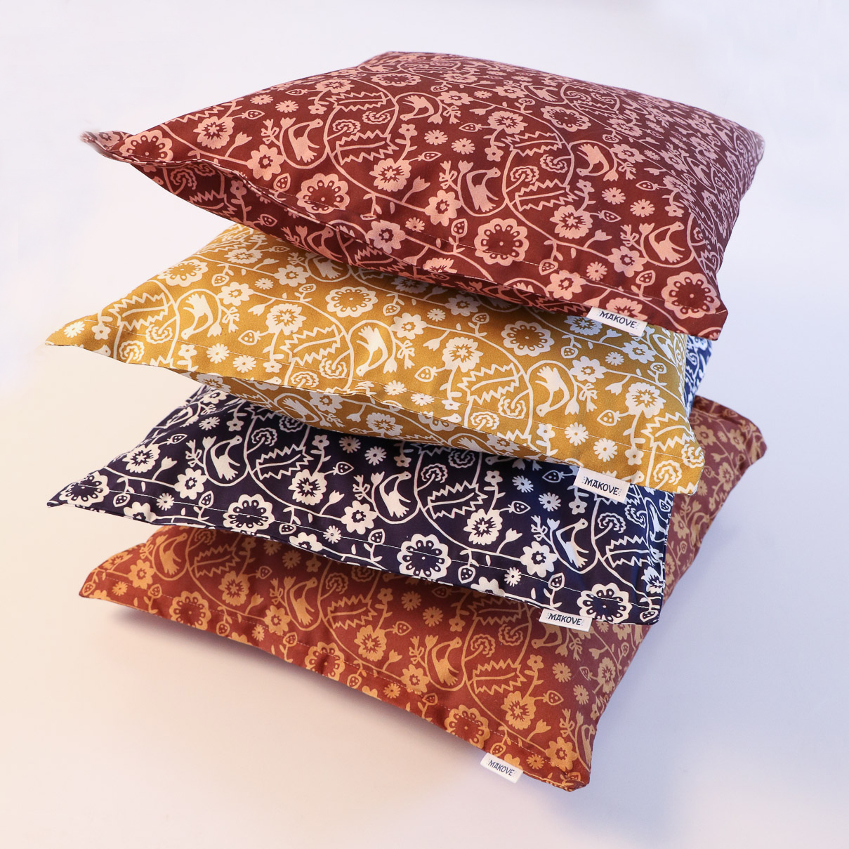 Vankúše sa za posledné roky stali veľmi populárnym a praktickým bytovým doplnkom. Vďaka nim si môžete rozžiariť a zútulniť Váš domov. Stačí jeden či dva a vaša sedačka, či posteľ hneď chytí nový dych. Dekoračný vankúš je aj ideálnym darčekom a vďaka našej “makovej” modrotlači určite zaujmete. Naša dizajnérka Zuzka sa vyhrala s detailami a vznikol krásny, svieži a moderný dizajn inšpirovaný klasickou modrotlačou z Hontu. Ak sa vám náš folklórny dizajn páči, určite si pozrite aj modrotlačové prestieranie a štólu na stôl.
